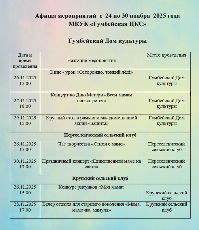 Афиша мероприятий с 24 по 30 ноября 2025 года МКУК «Гумбейская ЦКС»