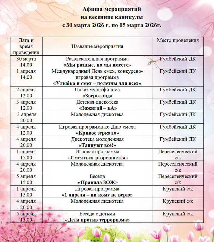 Афиша мероприятий на весенние каникулы с 30 марта 2026 г. по 05 марта 2026г.