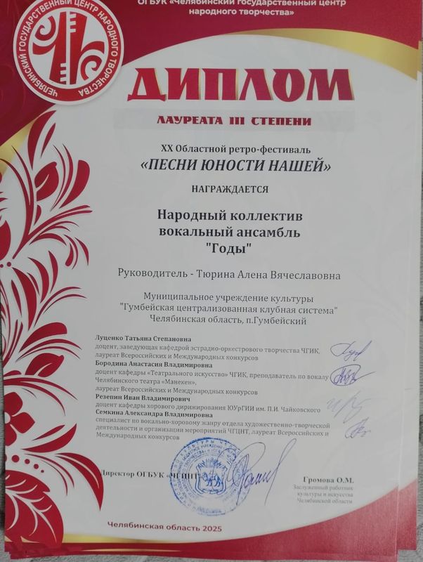 МКУК "Гумбейская ЦКС" выражает огромную признательность участникам нашего замечательного коллектива "Годы" за достойное выступление и получения Лауреата "lll степени".