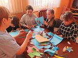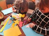 Из цветной бумаги ребята мастерили заготовки для ёлочных украшений в виде звёздочек, сердечек и шаров.